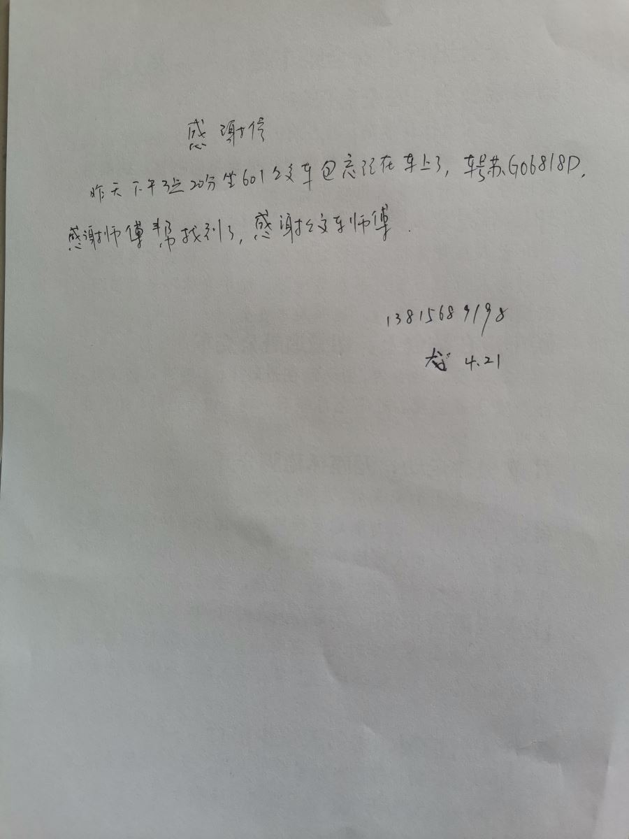 沒過多久,失主尤女士來到了大港路停車場調度室領取了自己丟失的包及手機,她當場寫下感謝信,對李傳新師傅表示萬分感謝。