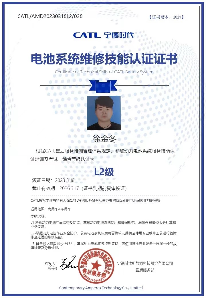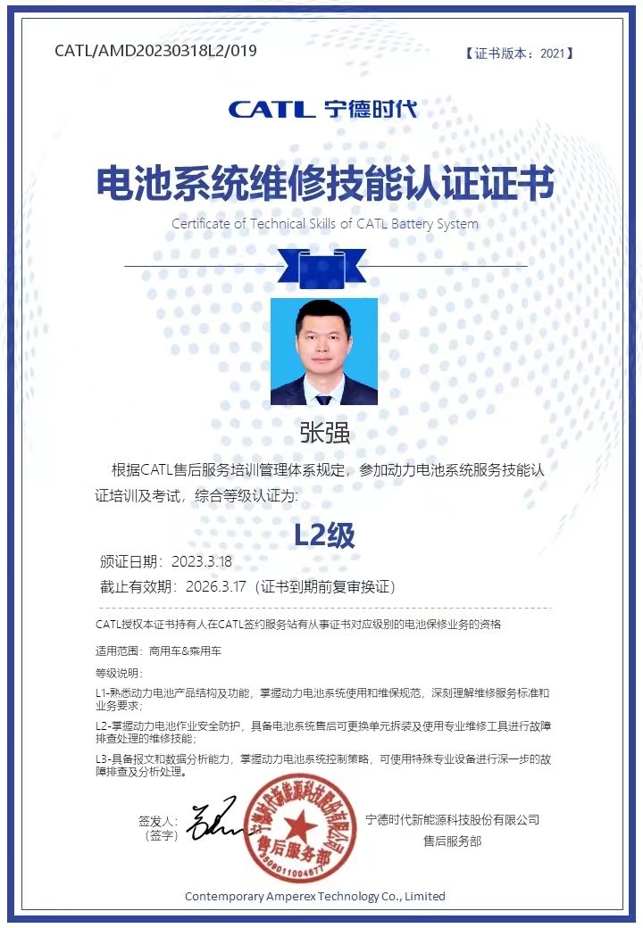 此次培訓選派張強、徐金冬兩名一線維修人員參加寧德時代在武漢舉辦的《鋰動力電池》L2-A培訓,培訓分為理論和實操,理論課內(nèi)容涉及認識商用車電池系統(tǒng)、電池均衡;實操課涵蓋了商用車上位機使用、安全作業(yè)防護與基本維修流程、充放電作業(yè)、商用車電池箱深度拆裝等重點內(nèi)容,參培人員利用5天的時間,參加培訓的人員認真學習,在實操訓練中逐步熟悉和掌握電池拆裝及使用專業(yè)維修工具進行故障排查處理的維修技能,最終通過理論、實操考核工作,獲得了寧德時代頒發(fā)的L2級維修技能等級證書。