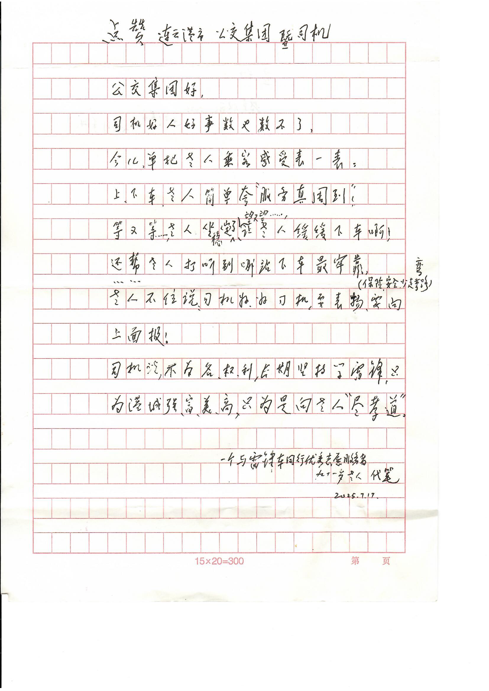 老人信中寫道:“公交集團好,司機好人好事數也數不了。”他特別提到,每次乘車時,司機都會耐心等待老人坐穩后才起步,到站后不急不躁,細心攙扶,確保老人安全下車。更讓老人感動的是,司機還會主動詢問目的地,并貼心提醒最佳下車站點,避免老人坐過站或走冤枉路。