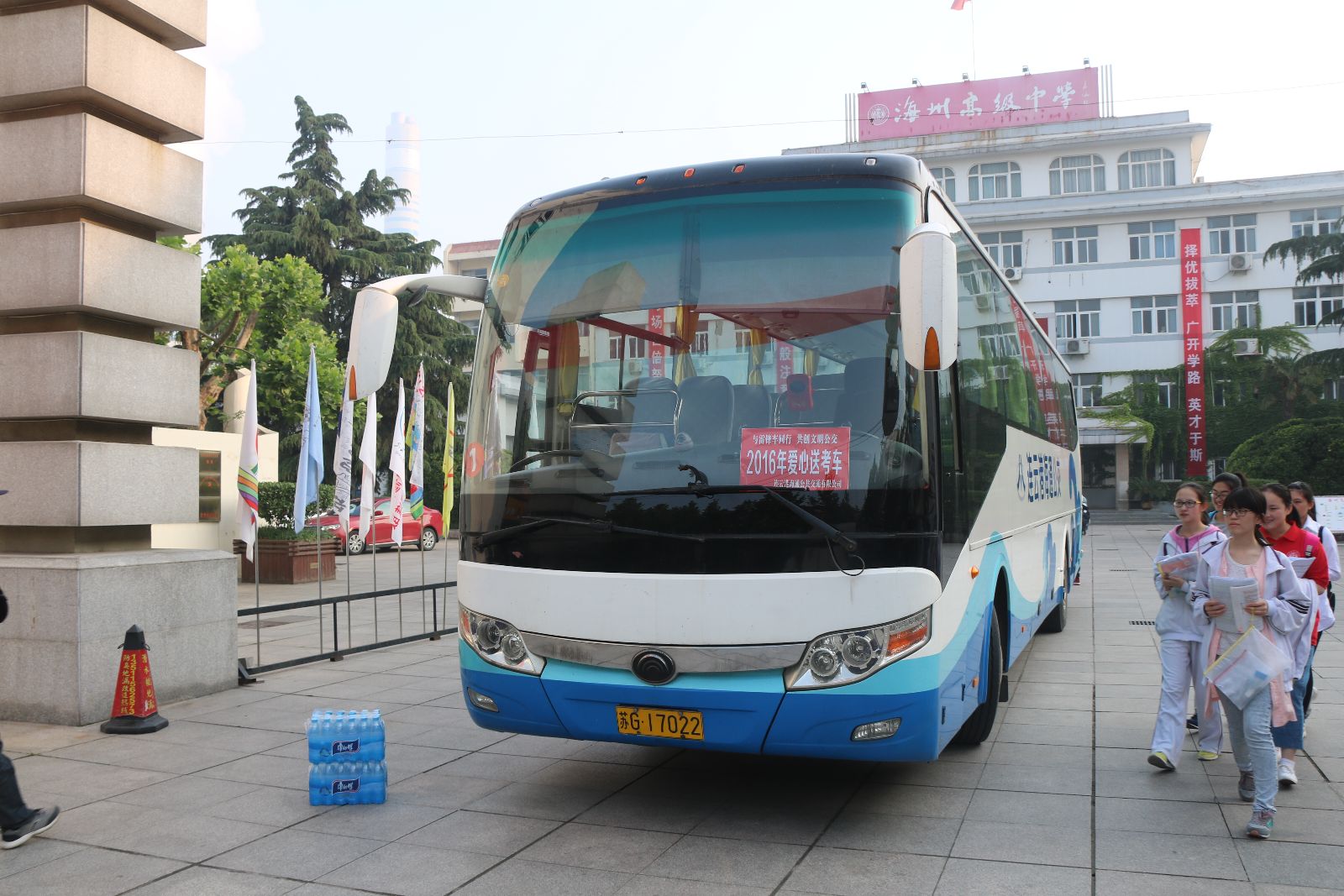 當天早上6點30分,海通公交的愛心送考車輛早已到達指定地點海州高級中學,6點40分,55名考生有序上車,公交工作人員給每一位考生發(fā)放一瓶礦泉水,預(yù)祝他們考試順利,并將莘莘學子們安全送到海州實驗中學考點。