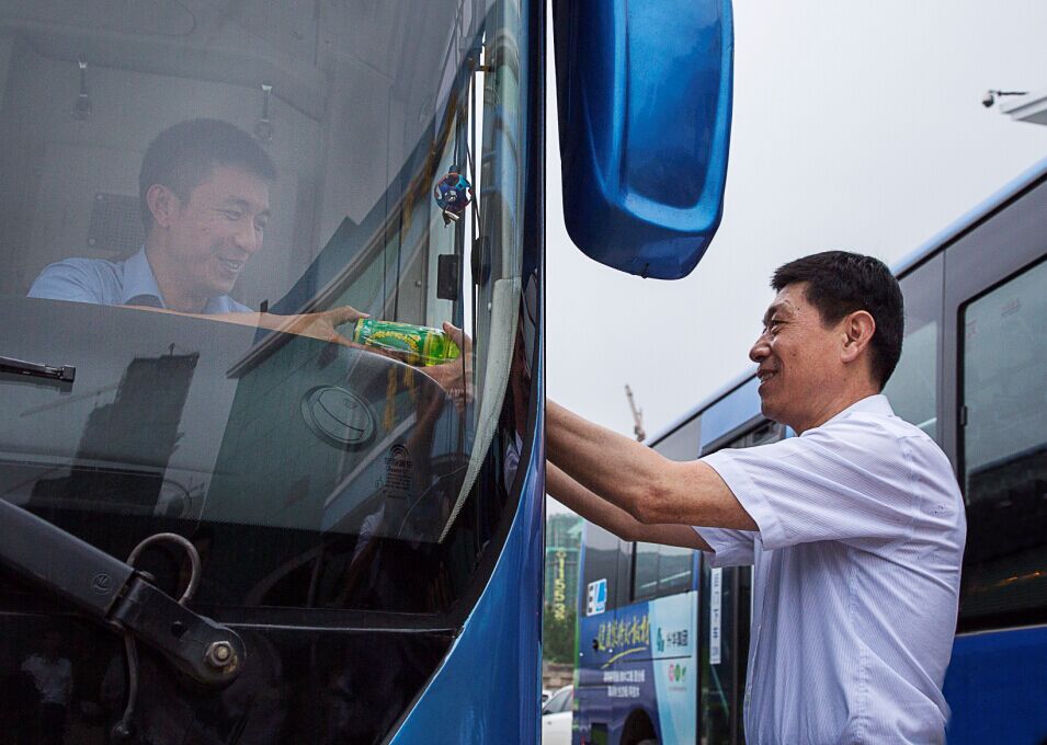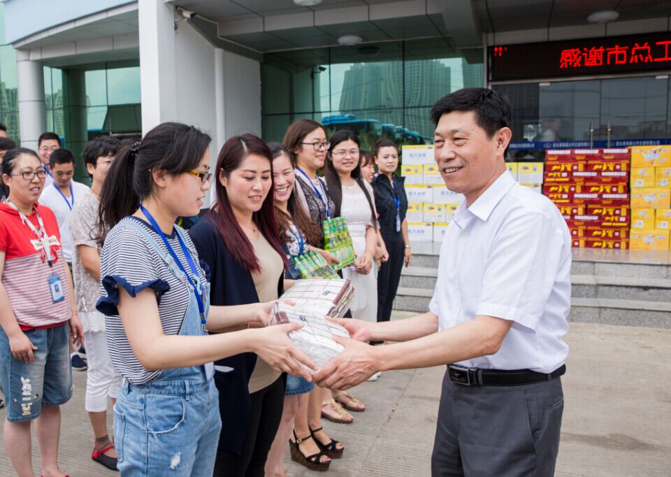 來源:黨群部 作者:雷蕾 7月15日上午,市總工會紀(jì)檢組長朱斌、勞工部部長吉文明等一行冒著高溫看望慰問堅守崗位的海通公交一線員工,他們把上級領(lǐng)導(dǎo)的關(guān)愛和夏日的清涼送到公交員工的心里。交通控股集團(tuán)工會主席王中永、副主席張曉紅等參加慰問。 我市即將迎來高溫天氣,海通公交公司千名員工戰(zhàn)高溫、斗酷暑,奮戰(zhàn)運(yùn)營第一線,為廣大乘客的出行付出了艱辛的努力。市總工會領(lǐng)導(dǎo)心系公交員工,他們冒著高溫來到海通公交公司,給一線公交員工送來飲料、綠豆、白糖、毛巾等,感謝公交員工在高溫酷暑條件下為廣大市民出行所作的突出貢獻(xiàn),并詳細(xì)詢問了他們在高溫期間的工作和生活情況,反復(fù)囑咐他們在夏季要特別注意身體健康,牢記安全生產(chǎn),做好本職工作。并叮囑隨行的企業(yè)領(lǐng)導(dǎo),一定要把夏季“送清涼、送安全、送法律”活動落到實(shí)處,讓廣大員工真正感受到組織的關(guān)愛。