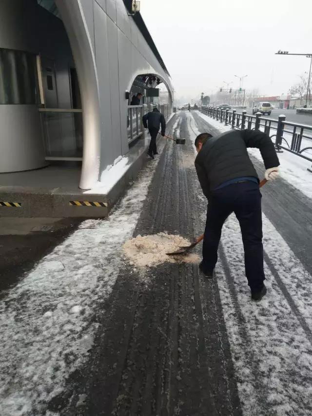 早上六點,BRT公司應急隊員協助站務員通過撒防滑鹽、清除積雪,做好BRT站臺防滑防凍工作,確保市民順利出行。明茂新能源公司及時啟動雨雪冰凍應急預案,對充電站設施設備進行全面檢查,對充電工絕緣手套、絕緣鞋穿戴情況進行檢查,要求充電工及駕駛員嚴格執行充電安全操作規程。