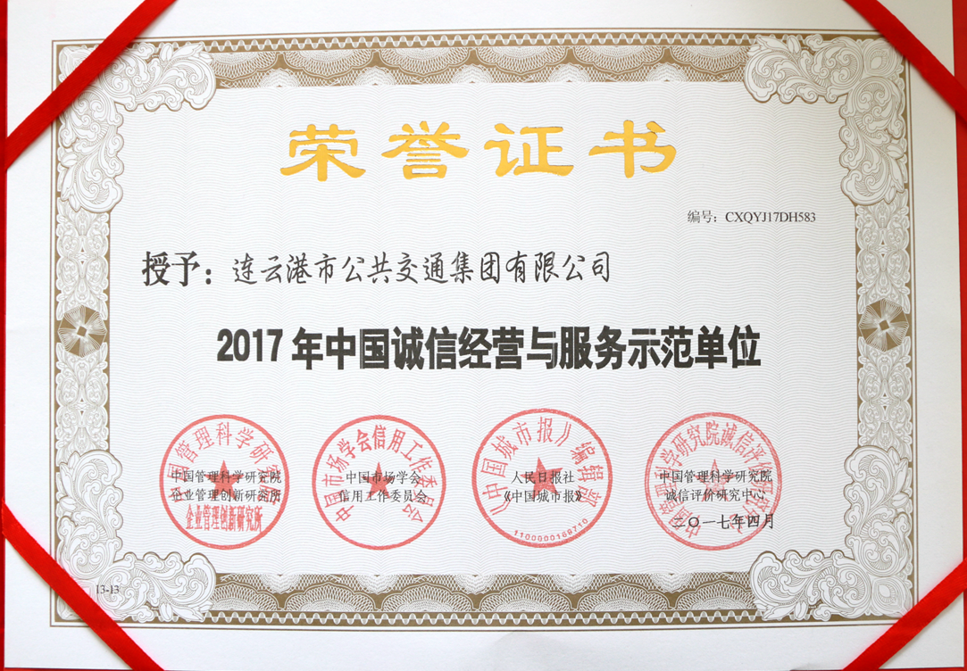 公交集團有限公司作為城市重要窗口行業,多年來一直秉持“服務于民、奉獻社會”的宗旨,始終堅持誠信為本的理念,以誠信、優質的服務,倡導“誠信服務、真情奉獻、開拓創新、和諧發展”的企業精神,在推進良好社會風氣的形成,構建和諧社會,傳播精神文明等方面發揮著重要作用。經過前期各個部門的評審、公示、復查等程序,連云港市公交集團榮獲第十四屆“中國誠信經營與服務示范單位”殊榮。