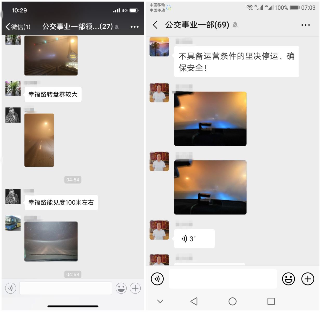 1月13日晚大霧包圍港城,當(dāng)晚19時(shí)左右,公交集團(tuán)各事業(yè)部微信群里發(fā)布大霧橙色預(yù)警信息,為確保冬季惡劣天氣行車安全,公交集團(tuán)立即啟動(dòng)惡劣天氣應(yīng)急保障預(yù)案。根據(jù)保障預(yù)案有條不紊的開展工作,利用微信、QQ及現(xiàn)場(chǎng)管理等形式及時(shí)共享路況大霧信息,全體安管人員加強(qiáng)路況巡視力度,做好安全行車教育工作,特別加強(qiáng)對(duì)城鄉(xiāng)線路的現(xiàn)場(chǎng)管理工作,確保車輛在線安全運(yùn)營(yíng)。