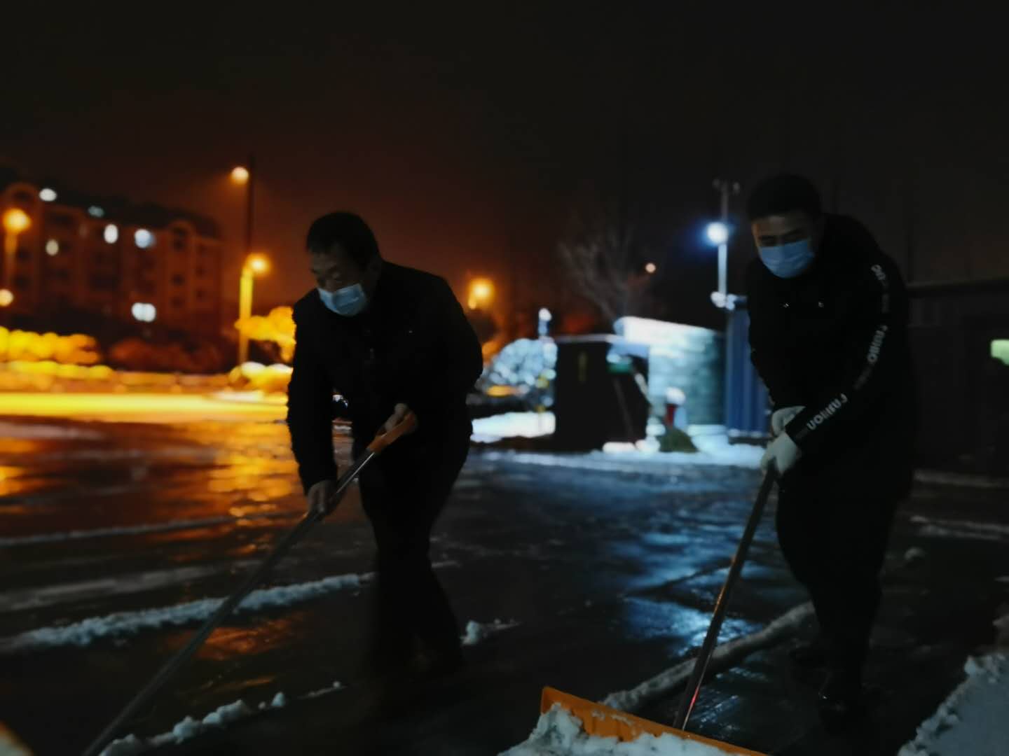在惡劣天氣下,經(jīng)營發(fā)展事業(yè)部立即啟動惡劣天氣應(yīng)急預(yù)案,嚴(yán)格落實各項疫情防控措施,勇挑重?fù)?dān),沖鋒在前。為了保障進出場車輛和人員的安全,便于隔天早上場站的疫情消殺工作, 2月15日晚上7點,經(jīng)營發(fā)展事業(yè)部“共產(chǎn)黨員防疫小組”便全部就位,大家揮著鐵鍬掃把,哈著熱氣,埋頭用力地鏟除著停車場地面的冰雪。經(jīng)過1個多小時的清掃,為了融雪再撒上一層鹽,大家才安心的坐下喝口水。
