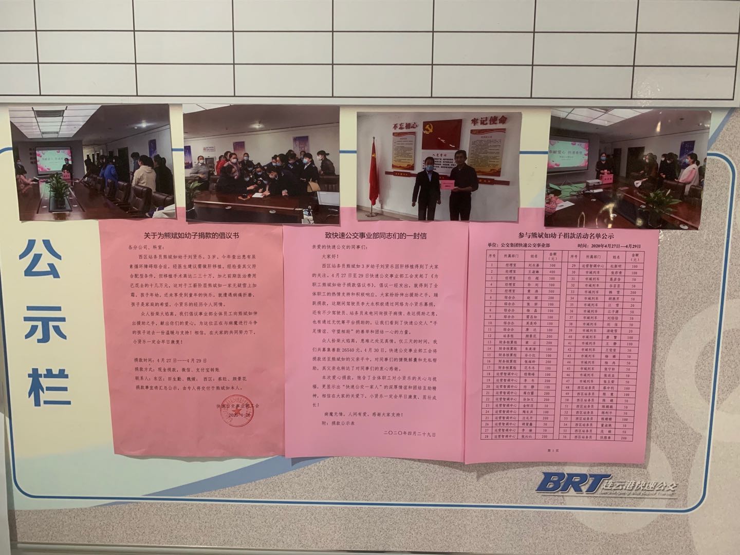 4月27日至29日,在快速公交事業(yè)部為職工熊斌如3歲幼子捐款活動正在進行,辦公場所、各場站的小小的捐款箱前排起了長龍,一份份愛心猶如涓流,匯聚成支持熊斌如的強大力量。